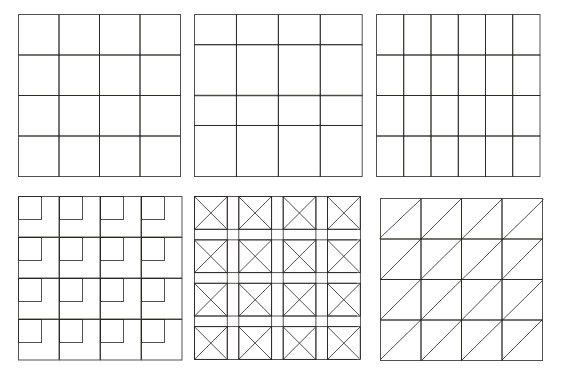 骨格重复:构成中图形的骨架、框架就称为骨格,主要作用是使图形有秩序地排列。重复构成是规律性骨格中最基本的骨格形式。如果将骨格的主要两元素——水平线和垂直线,进行调整间距变化,就可以得出不同的骨格形式。如图所示: