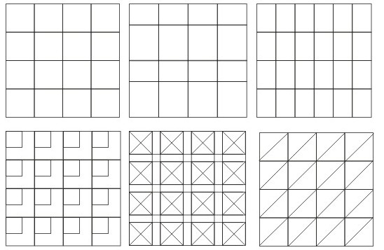 骨格重复:构成中图形的骨架、框架就称为骨格,主要作用是使图形有秩序地排列。重复构成是规律性骨格中最基本的骨格形式。如果将骨格的主要两元素——水平线和垂直线,进行调整间距变化,就可以得出不同的骨格形式。如图所示: