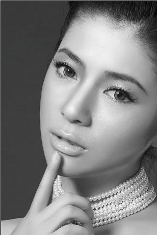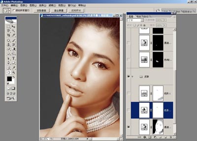 7.创建调整图层——通道混合器命令进行调节.将调整图层中的蒙版填充黑色,该调整图层的效果被隐藏,选择画笔工具,将前景色设置为白色,在人物的指甲上涂抹,为其着色如图1-9。