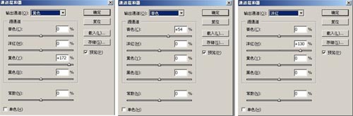 2、创建图层组名为皮肤,选择调整图层——通道混合器命令,在输出通道选项中分别选择青色、洋红、黄色通道进行设置,如图1-2、图1-3、图1-4。
