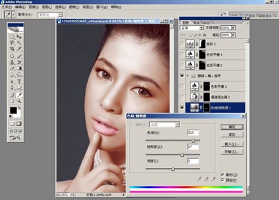 6.创建图层组名为眼睛、嘴。创建调整图层—色相饱和度进行调节.将调整图层中的蒙版填充黑色,该调整图层的效果被隐藏,选择画笔工具,将前景色设置为白色,在人物的嘴唇上涂抹,为其着色如图1-8。