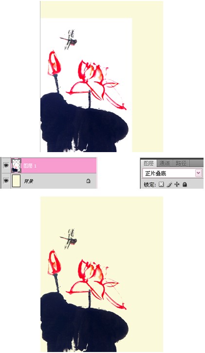 3)调入素材图片拖放到背景文件中,并安排在适合的位置,最后将图层1与背景图层做正片叠底效果,如图所示: