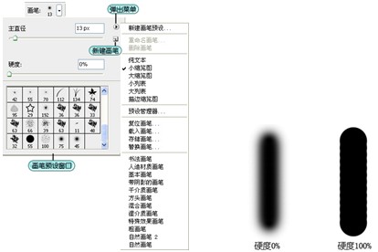 4) 弹出菜单:单击 按钮弹出下拉式菜单,用于改变画笔预设的显示方法、删除画笔、创建新画笔、改变画笔的名称,还可以调用Photoshop CS3提供的其他画笔预设,或是载入用户由其他途径获得的画笔预设。