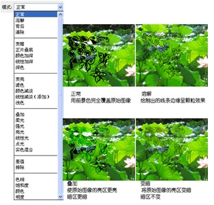 在“模式”下拉列表中设置画笔工具的绘画模式,不同的绘画模式将产生不同的绘制结果,如图所示。
