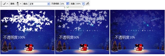 用于设置画笔工具所绘颜色的不透明度(取值范围为1%~100%),值为100%时直接绘制前景色,数值越低,前景色透明程度越强,1%时完全透明,如图所示。单击参数右侧的三角形按钮将弹出控制滑块,拖动滑块可根据需要设置不透明度,也可以直接在文本框中输入数值。