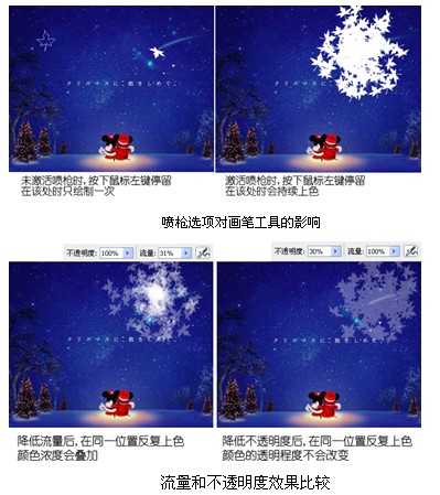 激活选项栏的 (喷枪)按钮后,使用画笔工具绘画时,如果在绘画过程中将鼠标按下后停顿在某处,喷枪中的颜料会源源不断地喷射出来,停顿的时间越长,该位置的颜色越深,所占的面积也越大,如图所示。流量决定了喷枪绘画时颜色的浓度,当值为100%时直接绘制前景色,该值越小,颜色越淡,但如果在同一位置反复上色则颜色浓度会产生叠加效果,如图所示。