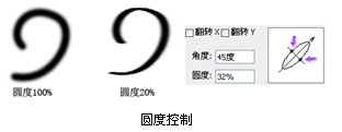 3)圆度抖动和控制:指定画笔在绘制线条的过程中,笔迹圆度的动态变化,如图所示。