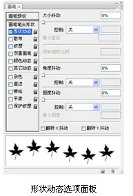 单击选择画笔设置项中的“形状动态”,形状动态面板中的选项决定画笔笔迹的随机变化,可使画笔粗细、角度、圆度等呈现动态变化,如图所示。