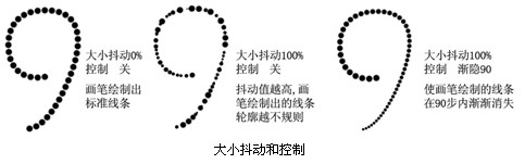 控制:在下拉列表中选择以何种方式控制动态远素的变化。共包括5个选项,关(不控制抖动)、渐隐(在指定步长数内控制抖动),如果安装了手写笔等数字化设备,还可通过钢笔压力、钢笔斜度和光笔轮控制抖动。