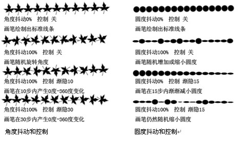 抖动:根据百分比值确定相关动态元素的随机程度。值为0%时,在画笔绘制过程中元素不发生变化,值为100%,画笔绘制时动态元素具有最大的自由随机度。