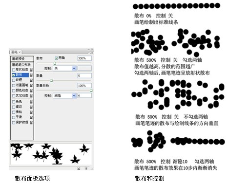 1) 散布和控制:指定画笔在绘制线条的过程中,笔迹的分散程度,如图所示。