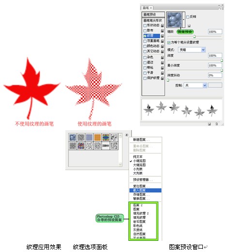 注意:在画笔中添加纹理不会改变画笔的颜色,画笔的颜色仍由前景色控制,纹理仅改变前景色的明暗强度。