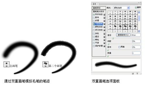 使两个画笔叠加混合在一起绘制线条。在画笔调板的“画笔笔尖形状”面板中设置主画笔,在“双重画笔”面板中选择并设置第二个画笔,第二个画笔被应用在主画笔中,绘制时使用两个画笔的交叉区域,如图所示。“双重画笔”选项面板如图所示。