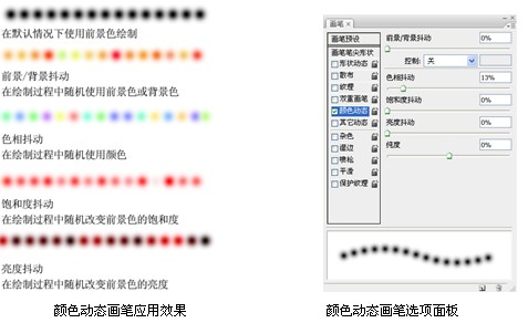 设置画笔在绘制线条的过程中,颜色的动态变化,如图5-35所示。“颜色动态”选项面板如图所示。