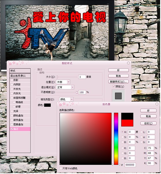 利用photoshop软件中图层色彩混合模式、描边命令、、图层样式、文字工具等。具体步骤如下: