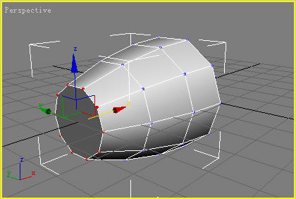 (6) 进入EditPoly(编辑多边形)命令中选择Vertex(点)编辑模式,选择Box(长方体)物体宽度上的三组段,然后用缩放工具向X轴做缩放处理,目的是为了以后加入Mesh Smooth(网格光滑)命令让边缘看起来棱角方一些,如图2-6。
