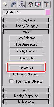 (2) 现在把刚刚制作完成的三个小零件组合在一块。进入Display(显示)面板,点击Unhide All按钮,把刚才隐藏了的物体全部显示出来,如图2-2。