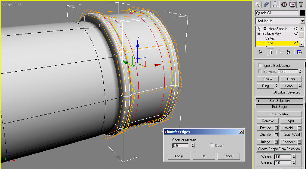 (4) 钢笔中间部分的效果不是非常理想,关键的是棱角处的关系不是非常明显。在Modify(修改)面板Edit Poly(可编辑多边形)命令中选择Edge(边)编辑模式,选择中间位置的两条线,用Chamfer(切角)工具把它们变成双条线,Chamfer(切角)的数值设置为0.6,因为Mesh Smooth(网格光滑)命令是以最近的边缘做弧线的,效果如图2-4。