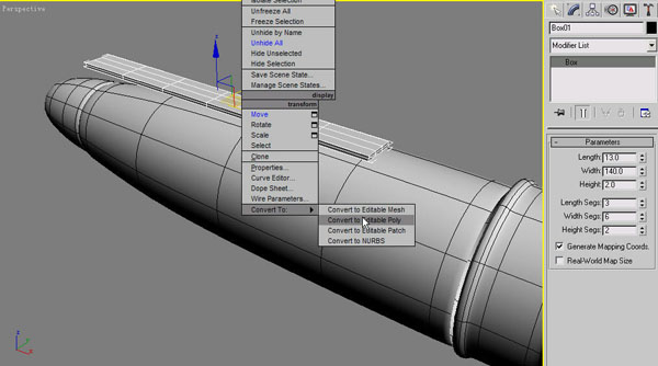 (5) 继续在Create(创建)面板三维物体中选择建立Box(长方体)物体,Box(长方体)物体的Length(长)为13,Width(宽)为140,Height(高)为2,内部Length Segs(长度段数)为3,Width Segs(宽度段数)为6,Height Segs(高度段数)为2。接下来在Box(盒子)物体上单击鼠标的右键,在弹出的快捷菜单中选择Convert to(转换为)>Convert to Editable Poly(转换为可编辑多边形)命令,将Box(长方体)物体转化成Edit Poly的编辑模式,如图2-5所示。