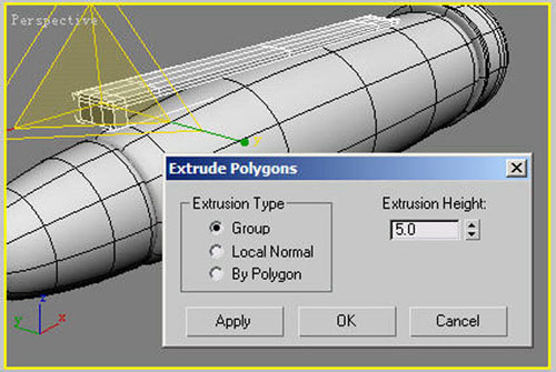 (7) 在Edit Poly(可编辑多边形)命令中选择Polygon(多边形面),编辑选择Box(长方体)物体底部的面,准备向下挤出新的面,通过Extrude(挤压)工具挤出向下数值为5,效果如图2-7。