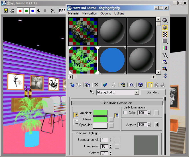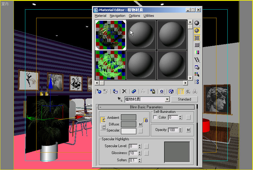 对待这种情况,我们可以只取消植物的表面通道贴图,而保留它的透明通道贴图,表面色设定和自发光设置与步骤(6)中完全一样,通道材质球及渲染效果如图1-6所示。