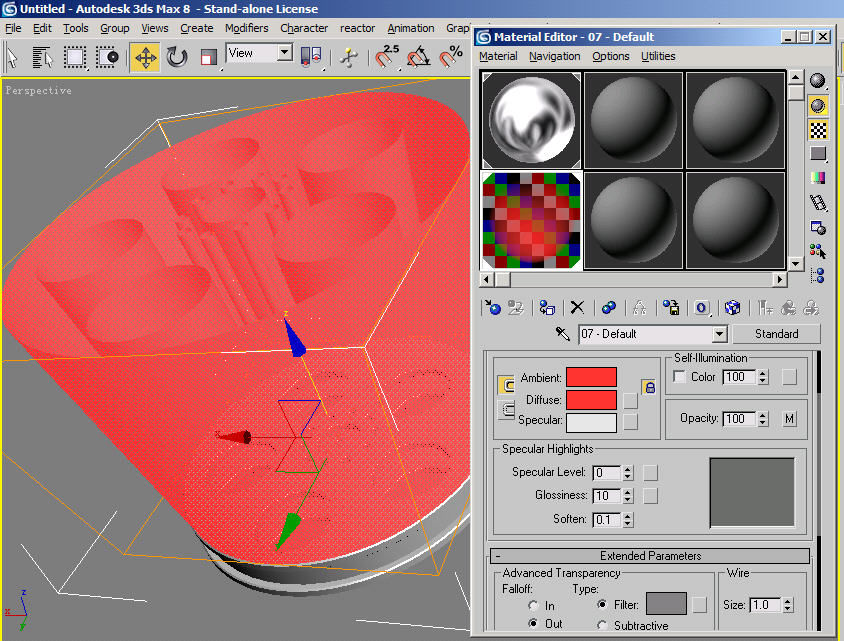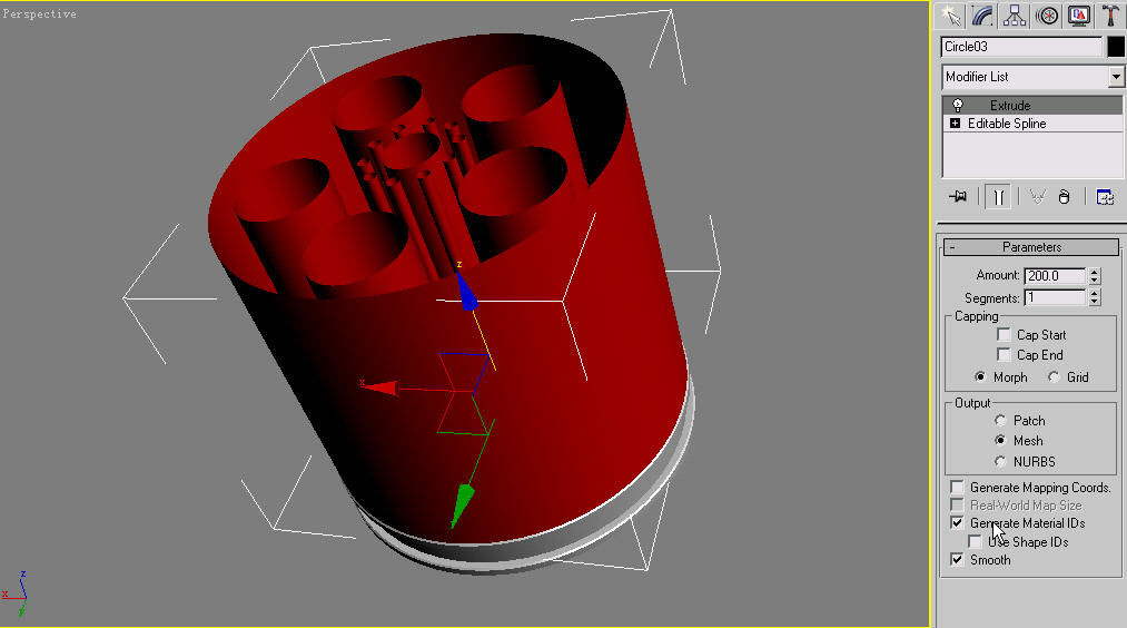 (6)为其执行“Extrude(挤出)”修改器,并去掉其顶面和底面效果,参数及效果如图1-6所示。