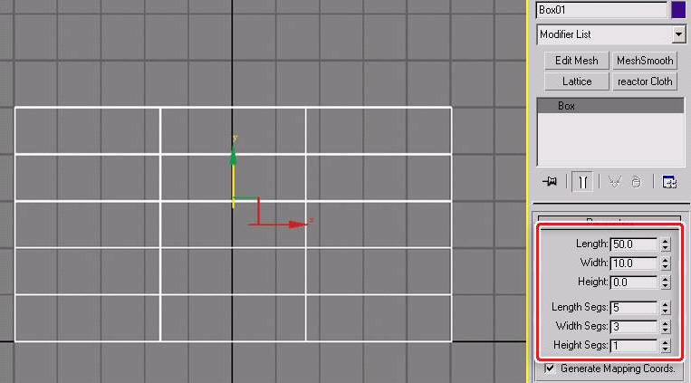 (1) 首先在Create(创建)面板Standard Primitives(标准几何体)中选择Box(长方体)物体,然后在Front(前)视图建立出Box(长方体)物体,Box(长方体)物体的Length(长)为50,Width(宽)为100,Height(高)为0,内部Length Segs(长度段数)为5,Width Segs(宽度段数)为3,Height Segs(高度段数)为1,如图4-1。