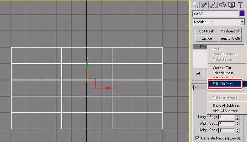 (2) 在Modify(修改)面板Box(长方体)物体命令上单击鼠标的右键,然后在弹出的快捷菜单中选择Convert to(转换为)>Convert to Editable Poly(转换为编辑多边形)命令,将长方体转化成Edit Poly的编辑模式,如图4-2。