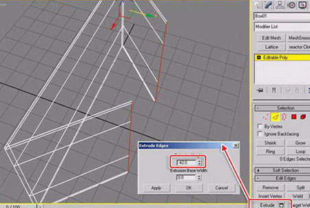 (4) 回到Perspective(透视)图中,选择边缘的两组线,点击Edit Poly (编辑多边形)命令中的Extrude(挤压)命令,得到了两组新的面。Extrude(挤压)命令Extrusion Height(挤出高度)的具体数值是-42,如图4-4。