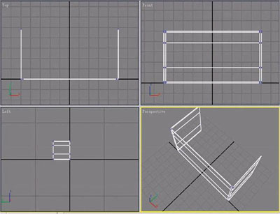 (5) 选择Edit Poly(编辑多边形)命令中的Vertex(点),把刚Extrude(挤压)的两组新面做位置上的调整,调整的和初始创建面成90度角。一个简单的三面墙体就制作出来了,如图4-5所示。