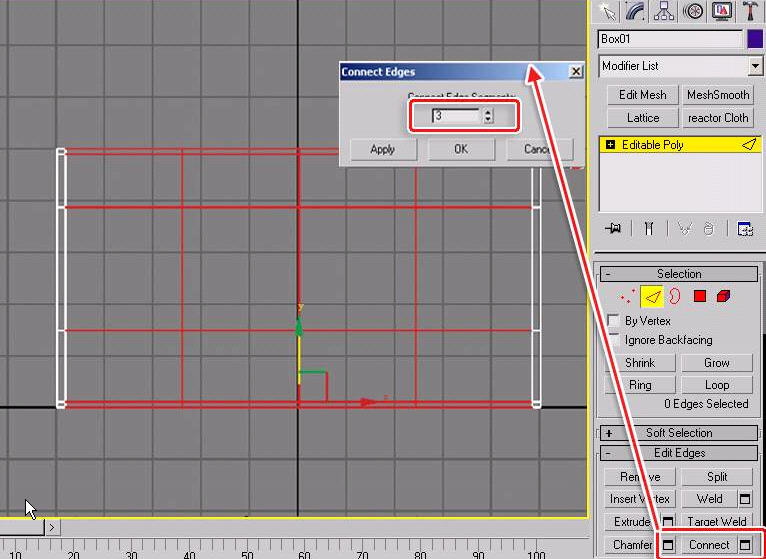 (6) 选择前面的横线,用Connect(连接)命令加入3条线。Connect(连接)命令主要用于创建新的边,如图4-6所示。