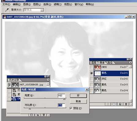 2、选青色通道,将对比度调小,亮度调大。人的皮肤色即可出来。不满意的话又可采用其它手段再调调。