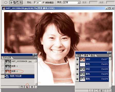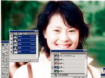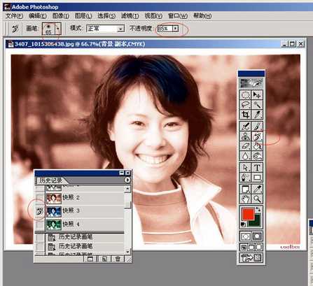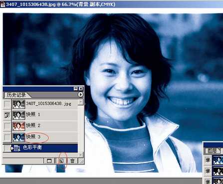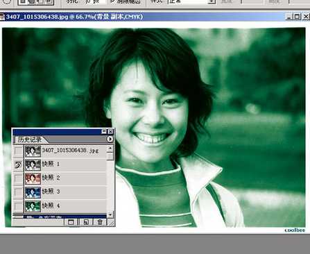 6、点快照2 ,恢复到橘黄色画面,现在利用历史画笔,画头发,点蓝色快照最左边空格,就可开始了。在大块面历史画笔的笔头选大点,不透明度也大点。在交接部位笔头选小点,不透明度也小点。你马上可以感受到快照和历史画笔的功效了。(在这里头发是偏蓝的,你可说成其它的)背景是利用绿色快照,原理和这一样。