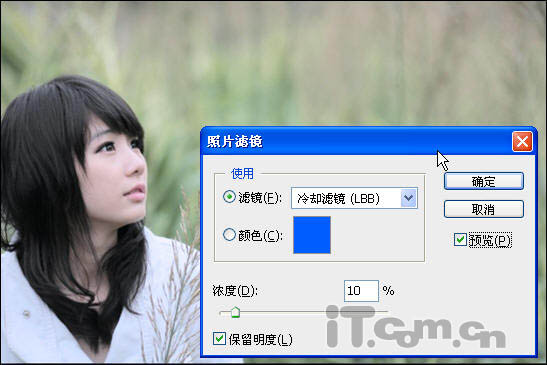 | 5、按下Ctrl+E快捷键合并图层,然后在菜单栏中选择“图像—调整—照片滤镜”,选择“冷却滤镜(LBB)”,设置浓度为“10%”,如图所示。(由于本例照片的色调是仿偏黄色,所以使用“冷却滤镜”,如果照片是偏冷色,则视照片色调而定选择“加温滤镜”) |