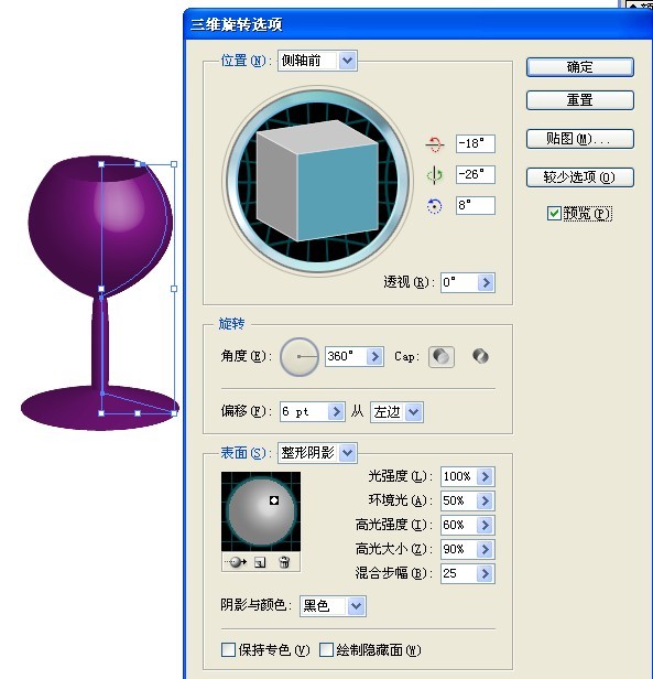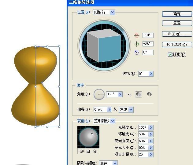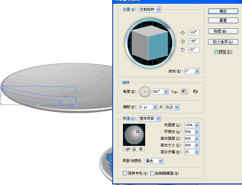 在illustrator中效果菜单下三维/旋转命令可以让简单的二维线条变成上图所示的三维图形。步骤如下:
