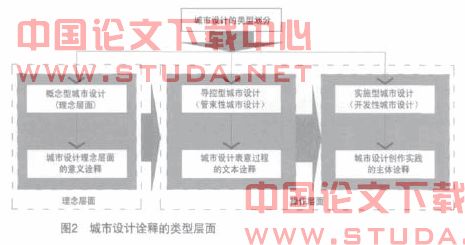 根据城市设计的诠释特性和城市设计学科特点的相关研究,笔者认为城市设计的类型可划分为:概念型城市设计、导控型城市设计和实施型城市设计3种,分别指涉城市设计注重形态概念、注重表意过程、注重创作实践在城市设计各个阶段不同的思维特性。概念型城市设计可称之为理念层面的城市设计,导控型城市设计(管束性城市设计)和实施型城市设计(开发性城市设计)可称之为操作层面的城市设计。在城市设计的诠释过程中,它们分别表现为城市设计在类型和阶段层面划分上的不同诠释途径,如在理念层面的意义诠释、在表意过程的文本诠释和在创作实践的主体诠释等(图2)。
