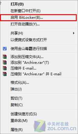 在Vista系统中就已经具备了BitLocker安全功能,而Windows 7的BitLocker功能则更强大些,不需要用户进行修改组策略等繁杂的设置,只要以管理员身份登录到Windows 7系统就可以使用。插好U盘后,在“计算机”中右键点击该U盘,在弹出菜单中选择“启用BitLocker”。