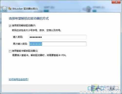此时会弹出一个“BitLocker驱动器加密”向导,根据需要选择解锁驱动器的方式,小编建议大家选择“使用密码解锁驱动器”。连续输入两次密码后(密码最少为8位字符),点击“下一步”。