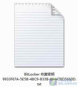 为了防止把密码忘掉,BitLocker会让创建一份恢复密钥保存到其它驱动器或打印留存,如果选择保存密钥,将得到一个文件名“BitLocker 恢复密钥***.txt”的文本文件。