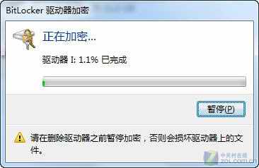 最后点击“启动加密”,BitLocker就开始为你的U盘加密了,这个过程需要的时间将由被加密U盘的容量和存储文件大小决定。