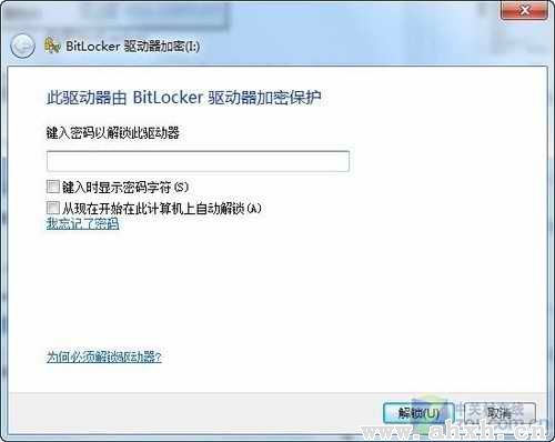 以后再将该U盘插入电脑后,会首先弹出一个“BitLocker驱动器加密”的提示框,只有正确输入密码后才能正常使用该U盘了。