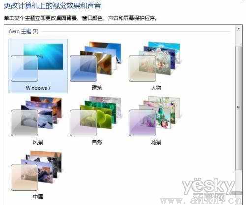 在桌面单击鼠标右键,在弹出的快捷菜单当中选择“个性化”即可打开Windows 7的个性化设置窗口。默认情况下,Windows 7当中已经提供了“Windows 7”、“建筑”、“人物”、“风景”、“自然”、“场景”和“中国”7套不同的Aero主题,用鼠标点击任意一套主题,就可以马上看到效果。