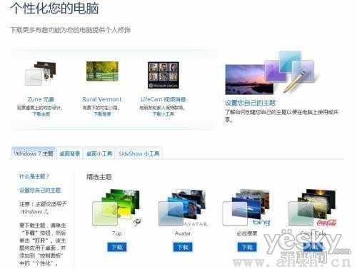 如何,够简单吧,赶紧选一个自己喜欢的主题界面吧。什么?有朋友不喜欢这几个主题界面,还想要更多主题包,没问题!点击主题选择框区域右上角的“联机获取更多主题”链接,即可打开微软的官方网站“个性化您的电脑”页面,下载更多主题包。