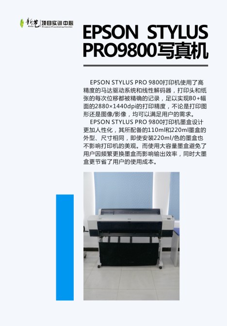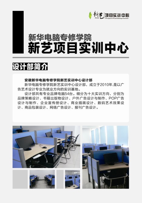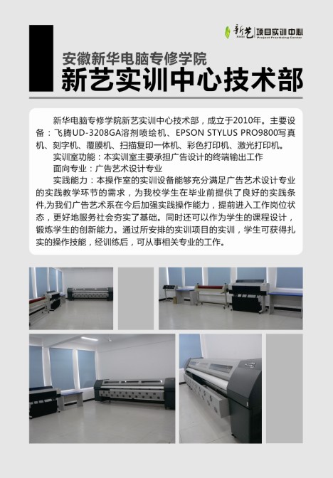 广告传媒设计师专业实训中心又名新艺实训中心。包括苹果电脑、彩色打印机、手绘板、扫描复印一体机、刻字机、写真机、喷绘机、投影仪等设计制作、输出和各环节的必备硬件,其硬件条件与环境整体不低于中型设计公司水平。目前此套配置标准,在国内培训院校中,属顶尖水平。