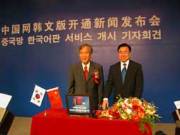 中国网总裁黄友义(右)和韩国明日报集团董事长张明国共同点击开通中国网韩文版