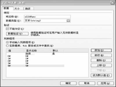 文本框添加后,为了便于我们以后快速输入产品型号,可以在“产品型号”项中添加一个下拉列表框,填写表单时只需在该项中选择需要的产品型号即可。添加时在“控件”列表中将该“下拉列表框”控件将“产品型号”项拖动到相应的位置并双击该下拉列表框,在打开的“下拉列表框属性”对话框中对其属性进行设置。其中在“绑定”项中对该下拉列表框的域名称、数据类型进行设置,勾选“验证”项中购选“不能为空”复选框,这样以后在填写表单时该项必须填写。在下面的“列表框”项中选择“手工输入列表框项”单选项,并单击下面的“添加”按钮,在弹出的添加选项中输入下拉列表中的各个选项。随后单击确定即可。